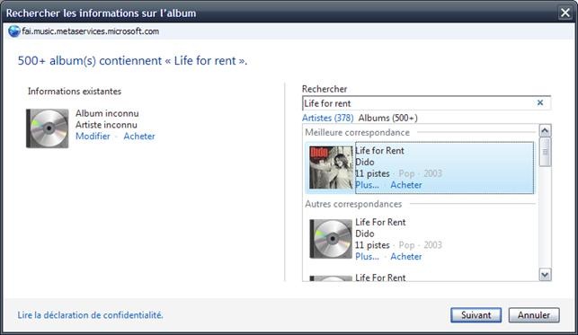 Dans le cas ou l’album n’apparait pas du premier coup, il vous sera demandé de donner quelques informations sur l’album. N’hésitez pas à taper le nom de l’album (ici « Life for rent » de Dido) :